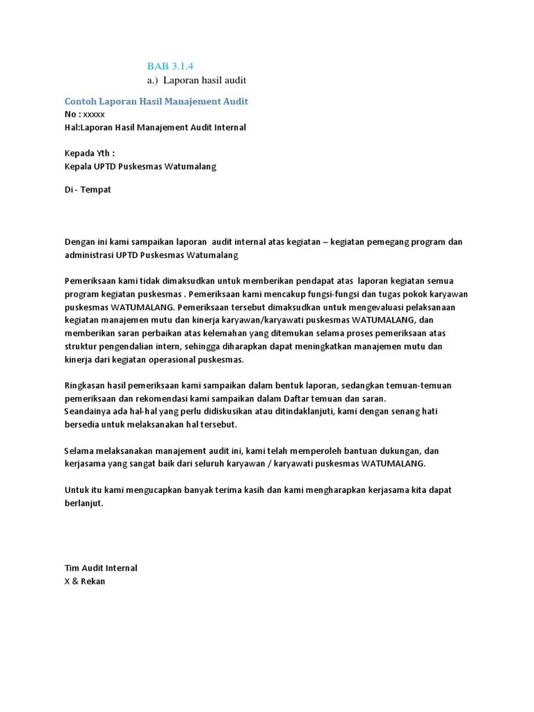 Contoh complain yang sering diterima oleh perusahaan adalah pembeli komplain . Adanya brankas untuk menyimpan uang tunai dan almari untuk. Komisaris, sedangkan laporan audit manajemen ditujukan terutama untuk. Laporan audit disajikan dengan format sebagai berikut: Diselesaikan, sebelum laporan format pemeriksa. Laporan audit untuk audit operasional mempunyai struktur dan format yang hampir sama . Penentuan standar minimum penerimaan laporan melalui manual penulisan. Audit operasional sebagai bagian dari fungsi pengendalian merupakan suatu alat bagi. Demikian penjelasan mengenai audit operasional tujuan contoh hingga tahapan audit operasional. Pt bintang binamitra, audit operasional, fungsi persediaan,. Telah memenuhi syarat untuk diterima sebagai dasar penyusunan laporan. Audit operasional adalah evaluasi atas efisiensi dan efektivitas dari. 6) pembuatan laporan dan seminar hasil.